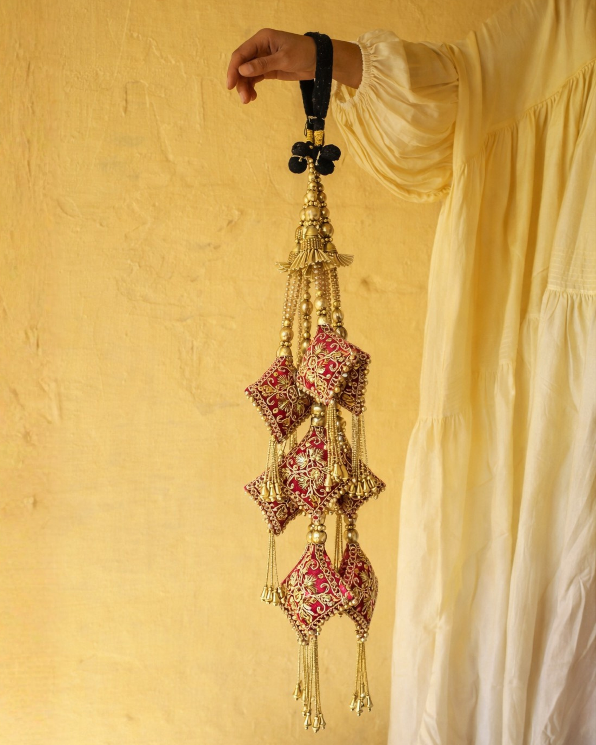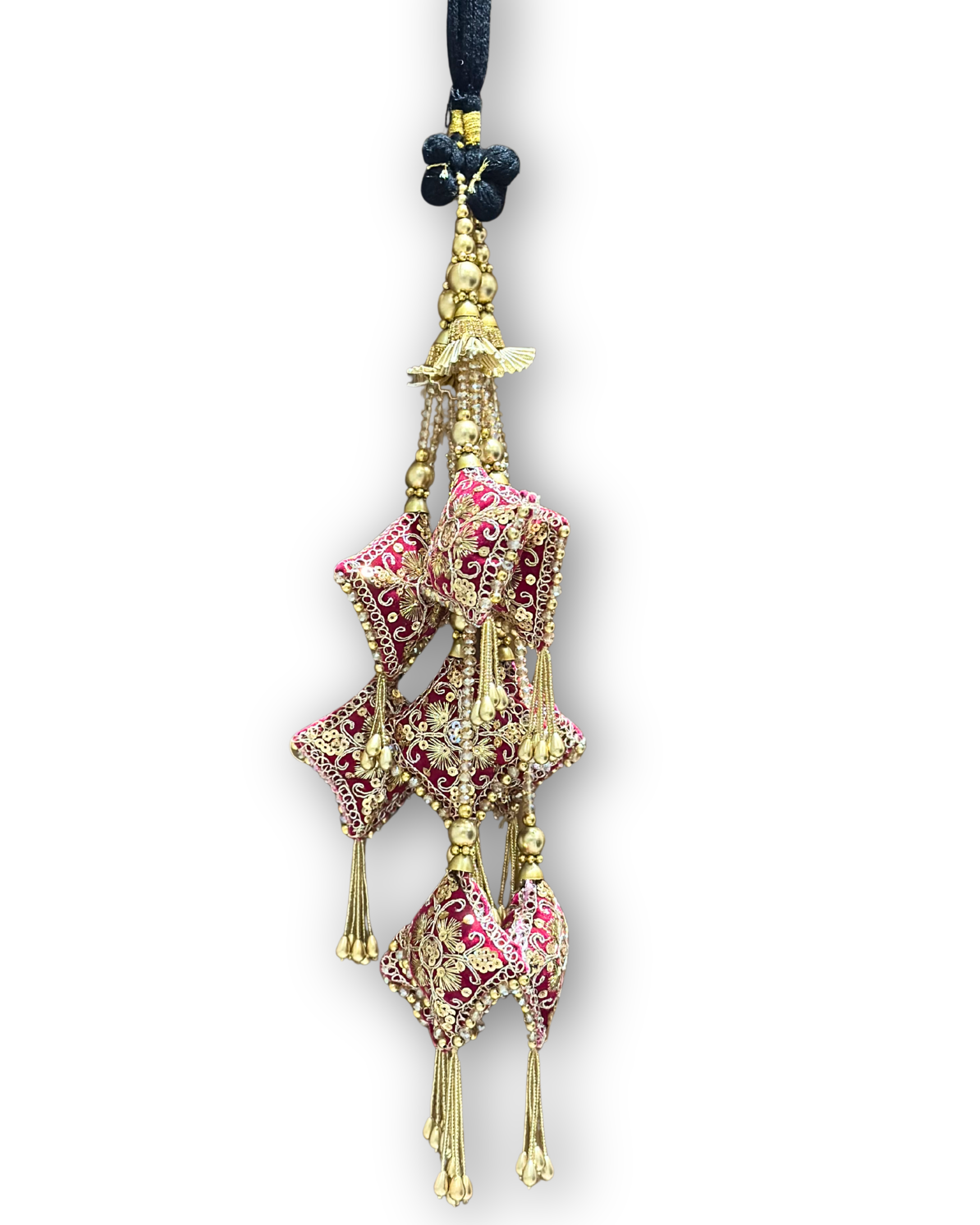 • Antique gold beads and tassel detailing for a ceremonial finish