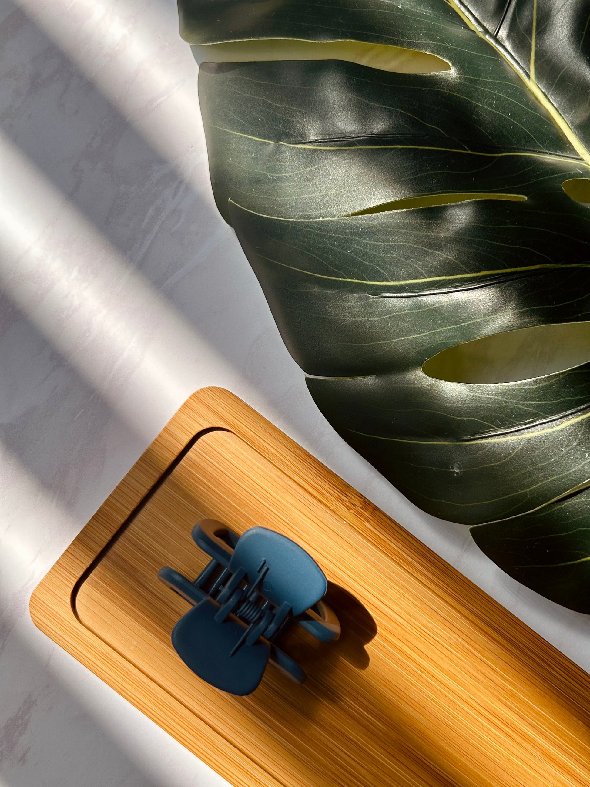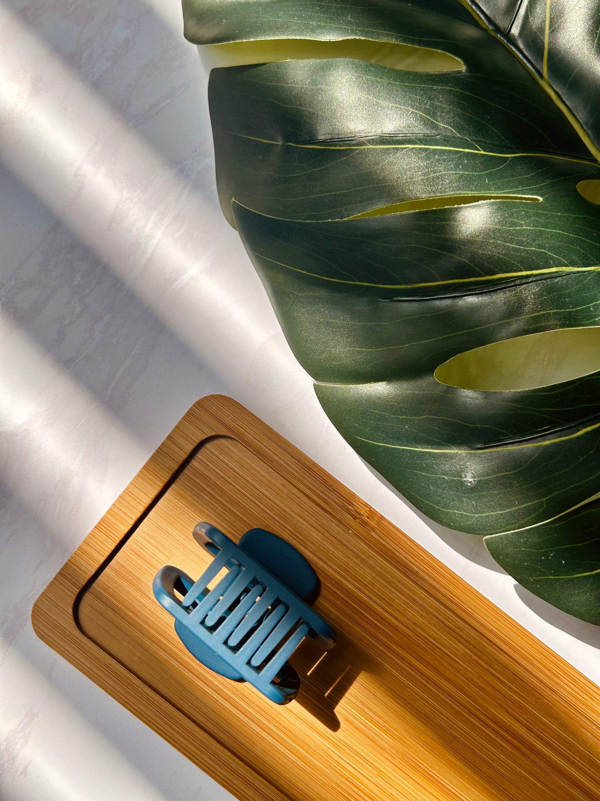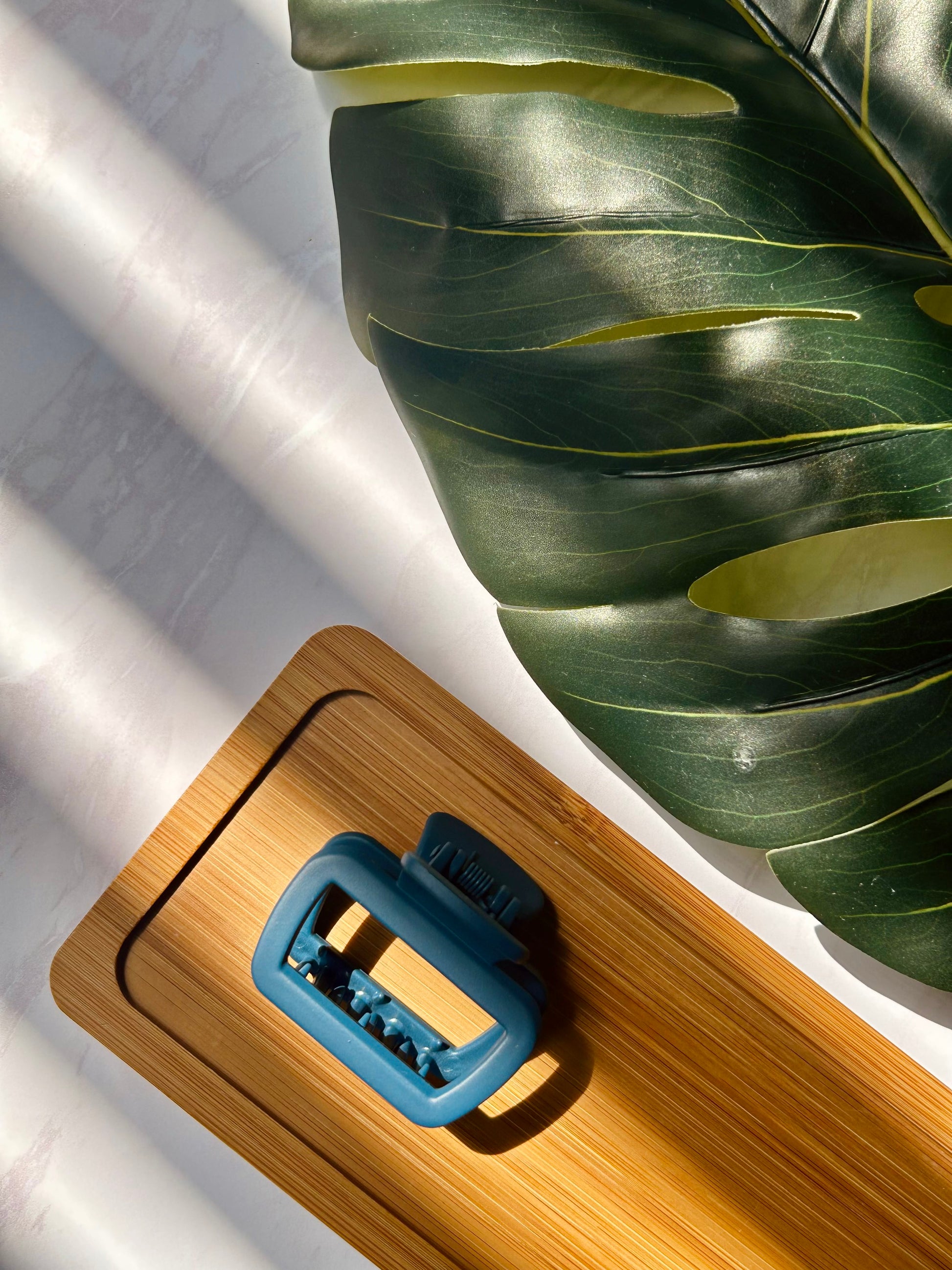 The Teal Blue Matte Claw Clip that adds a pop of golden warmth to everyday styles.