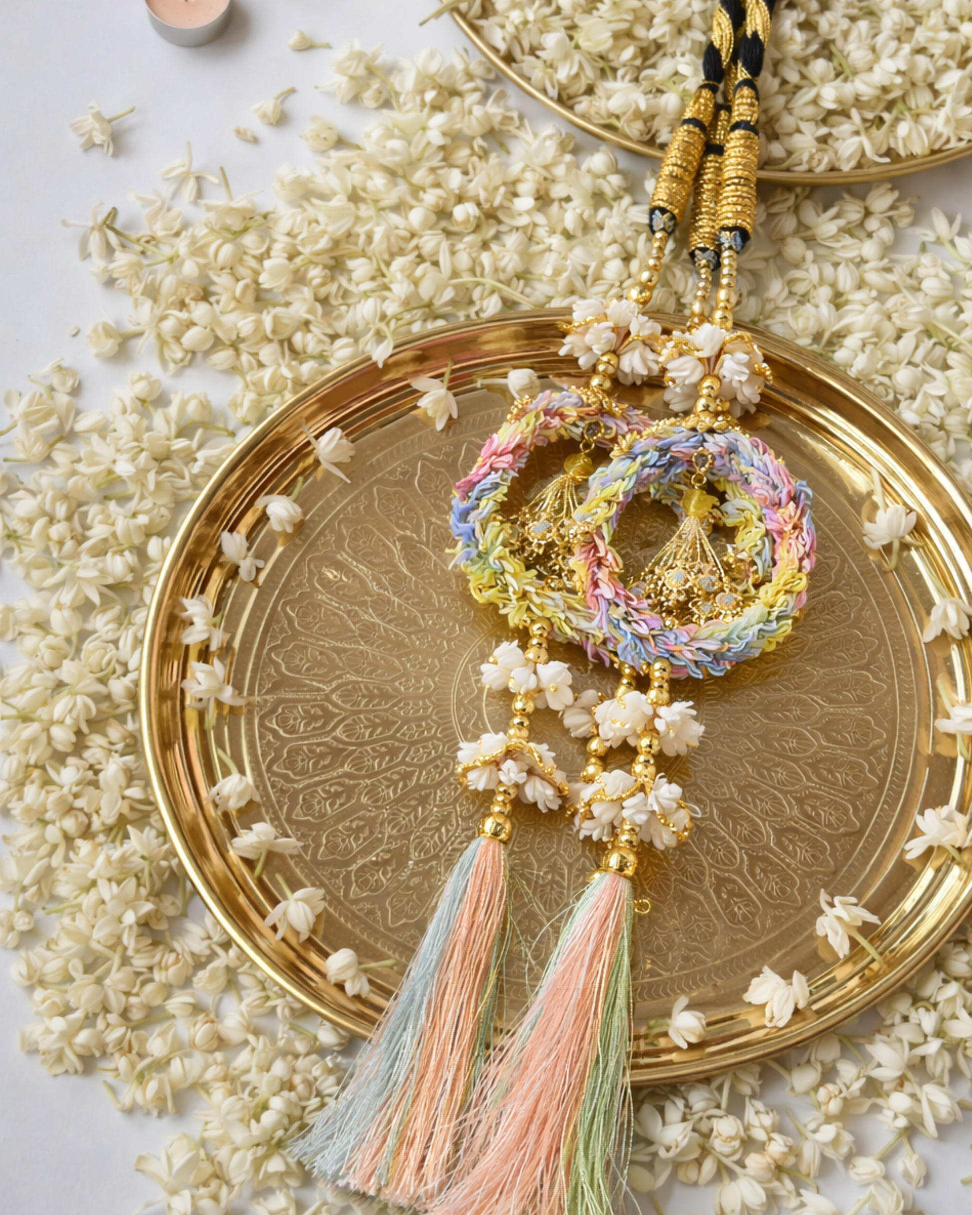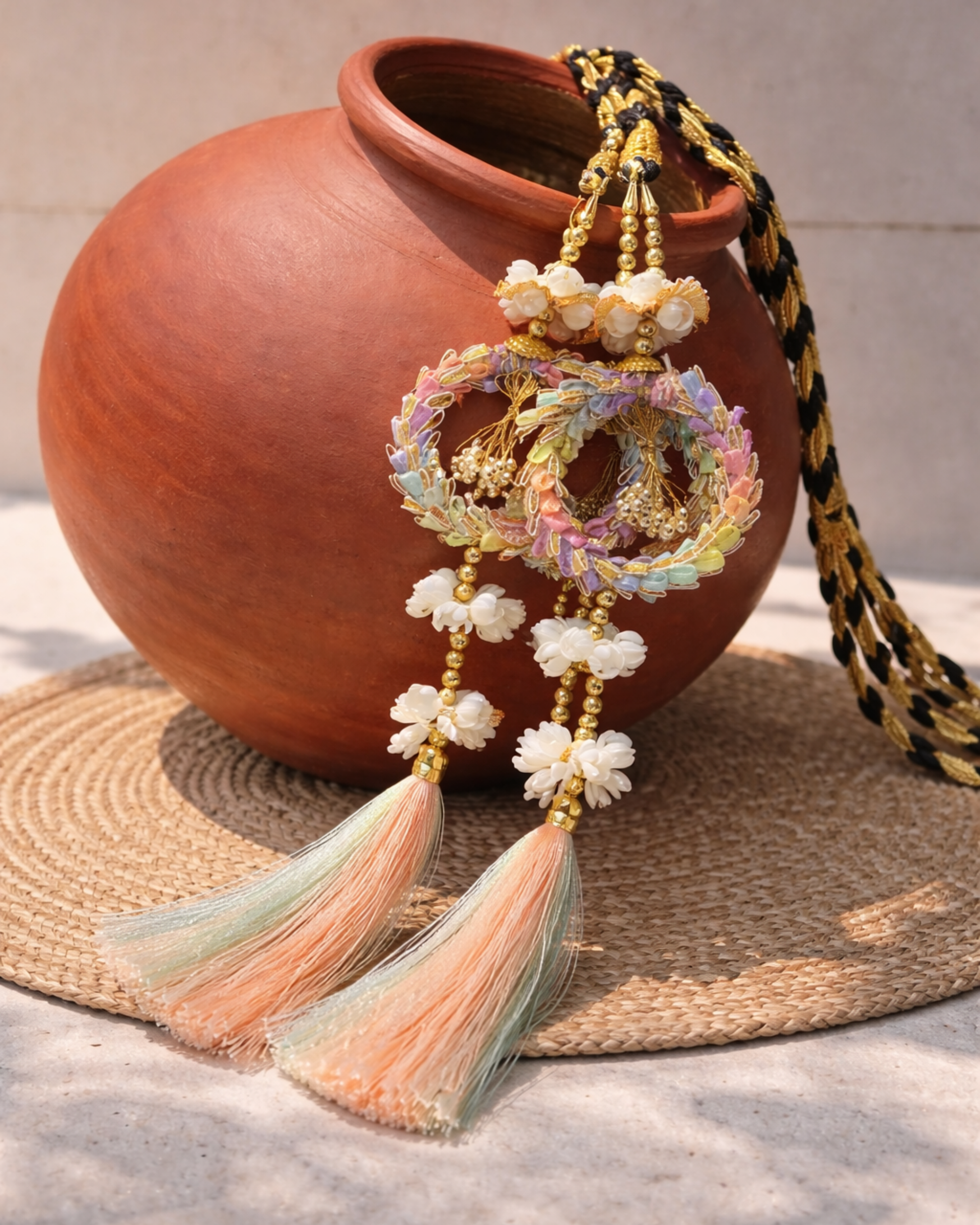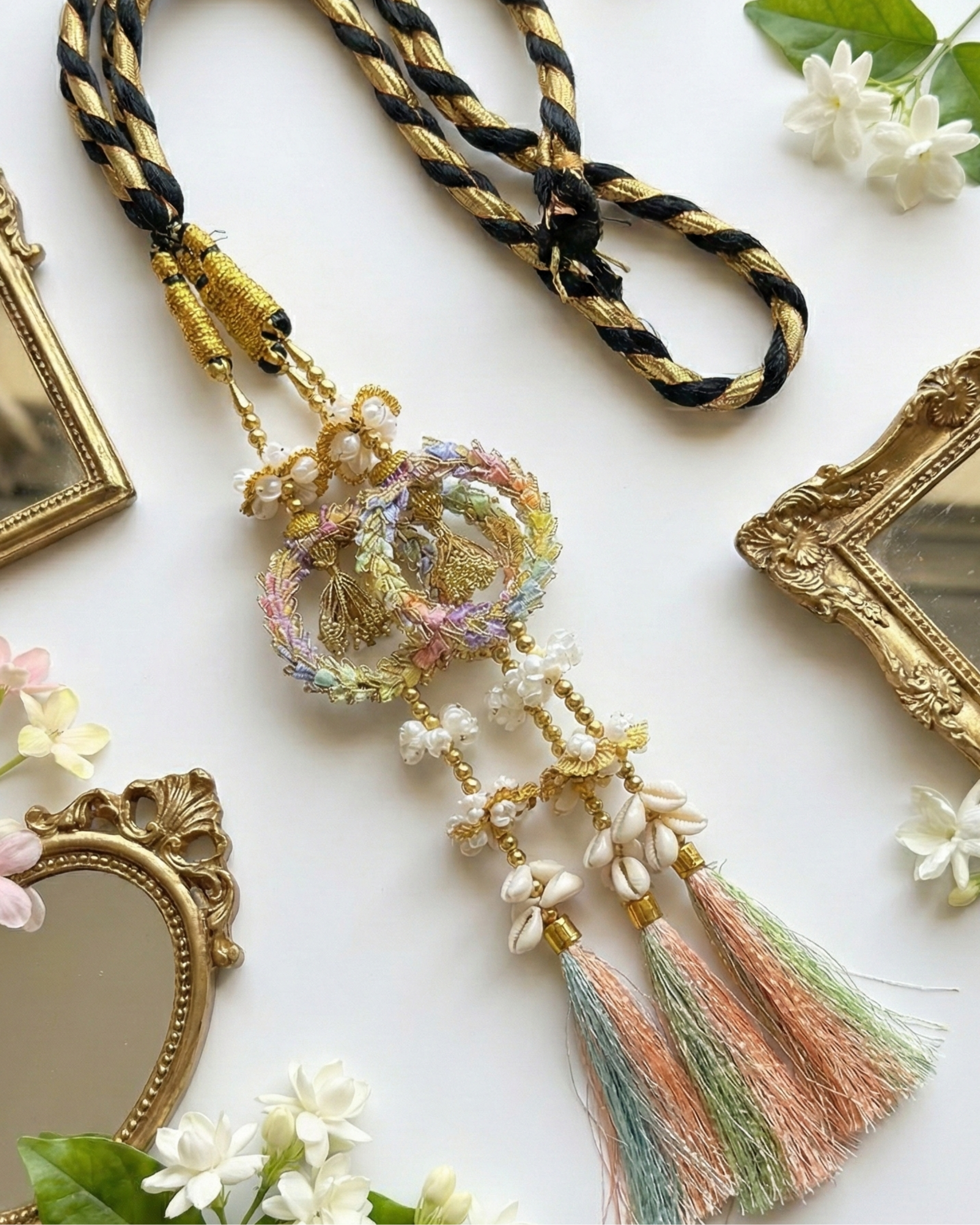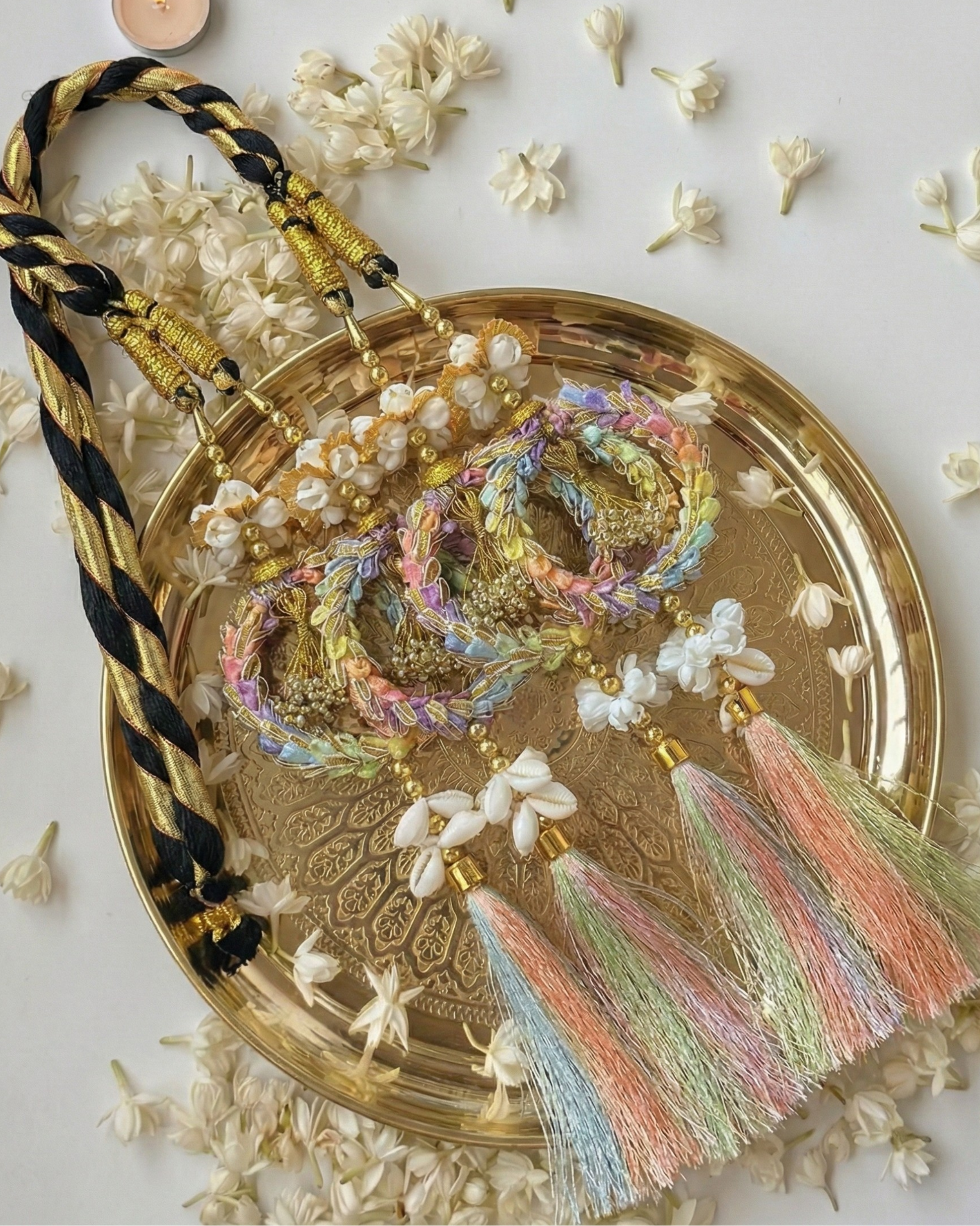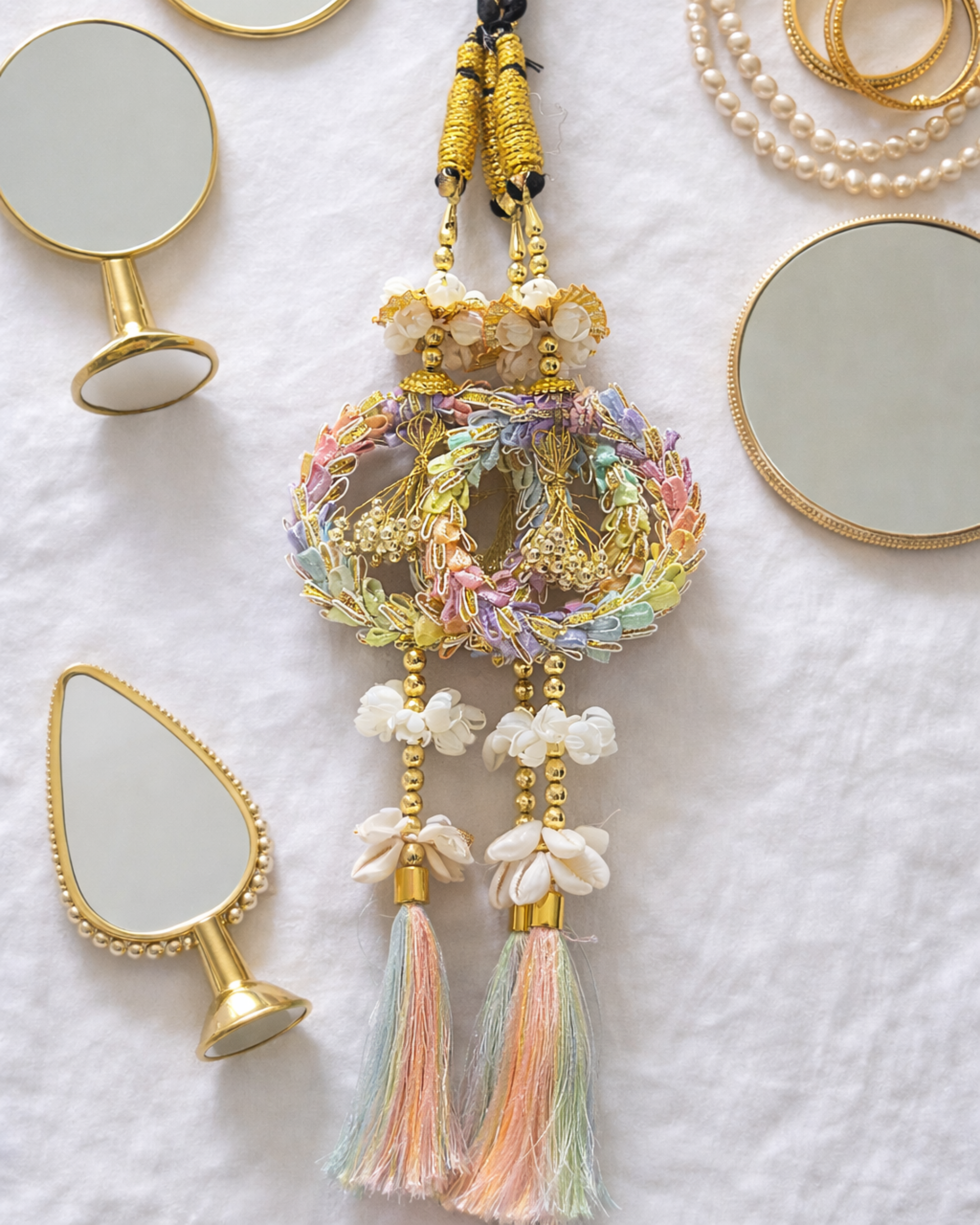 • Pearl and bead accents paired with soft pastel tassels